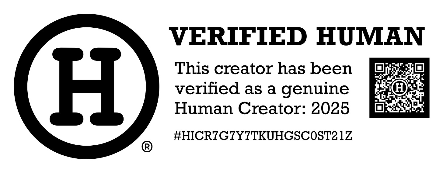 So, I have joined the movement to protect my work and say, “I am a living, breathing being who wrote this essay.” I hope if you are a writer and are reading this, you will also choose to become a certified human creator. Perhaps if enough of us take this stance, we will, as they say at the Human Intelligence Project: Elevate human creativity in the age of AI.