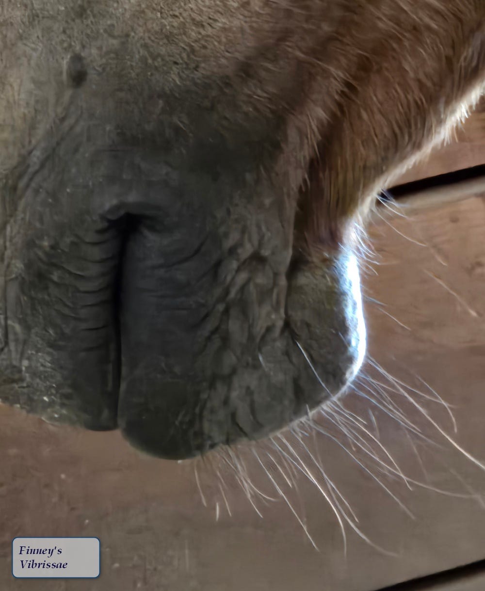 Equine vibrissae are fascinating. There are two types: macro-vibrissae, which are thicker and longer and help determine distance and width of an object—Huh. What is that round thing in front of my nose?—and micro-vibrissae, which are closer to the mouth. These little dudes are shorter and thinner and used for object recognition—Hey! It’s an apple!
